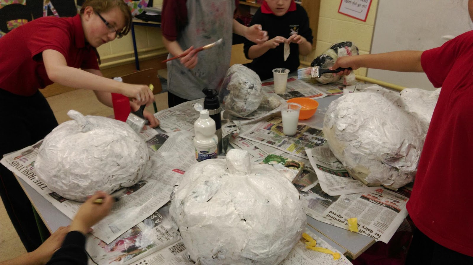 As of yesterday, they looked like slightly soggy oversized garlic but today we started priming and painting them orange. Tomorrow we will put the finishing touches to them